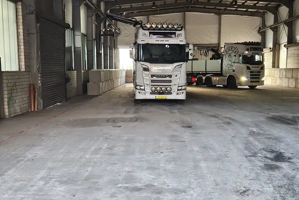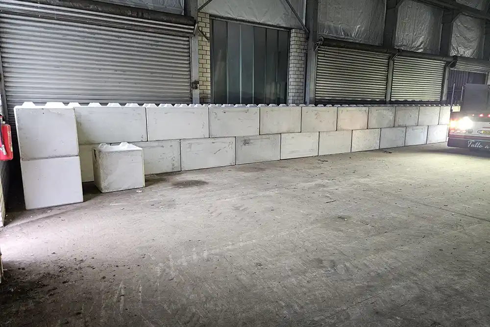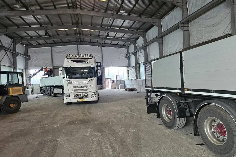 Net over de Duitse grens in het stadje Bad Bentheim hebben we 125 betonnen legioblokken geleverd. Met blokken van 160 80 80 cm en 80 80 80 cm zijn er binnen een bedrijfsloods twee wanden opgebouwd, dit hebben we direct vanaf onze eigen vrachtwagens gedaan. De wanden dienen voor bescherming van de loods en als keerwanden. Er komen losgestorte bulkgoederen te liggen waaronder houtsnippers.